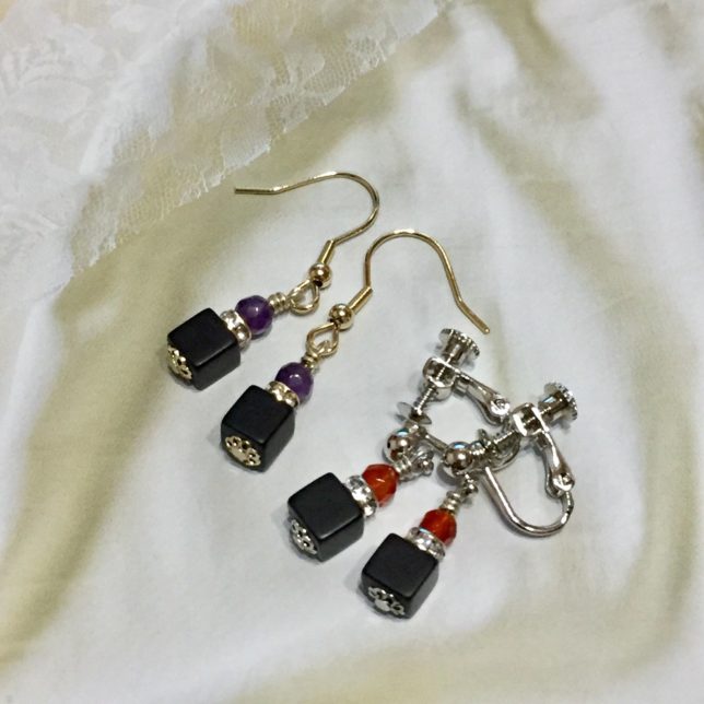 可愛いキューブ型のオニキスに、ハロウィンカラー(紫=アメジスト、オレンジ=赤メノウ)の石をプラスして作ります。