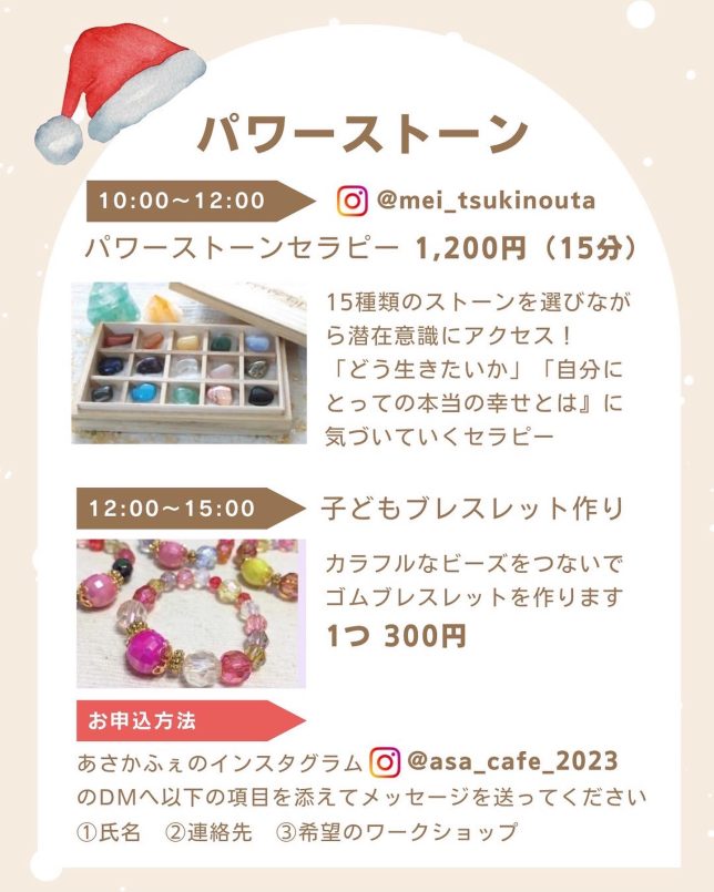ご予約は、あさかふぇさんのインスタ@asa_cafe_2023のDMに、①氏名 ②連絡先 ③希望のワークショップ を書いてお送りください。